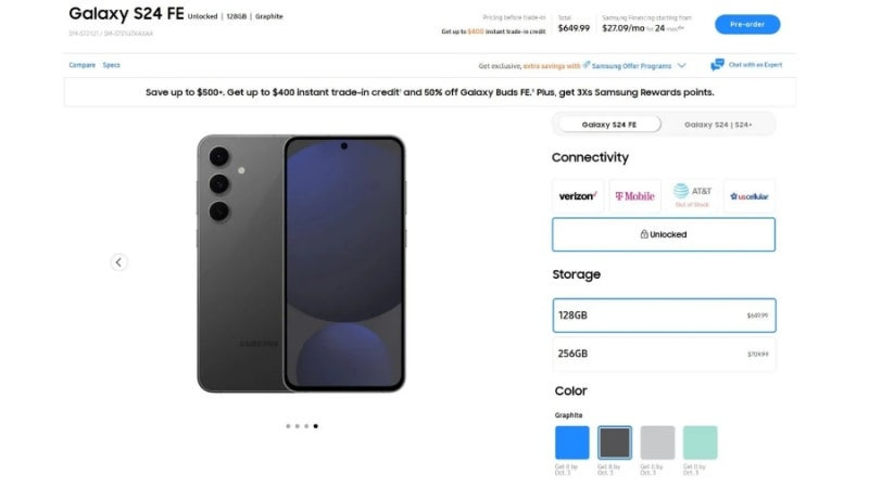 갤럭시 S24 FE의 사전예약은 2024년 11월 1일부터 시작되었습니다. 가격은 자급제 모델 기준으로 $649.99로 책정되어 있으며, 다양한 통신사와의 제휴를 통해 더 많은 혜택을 제공하고 있습니다.