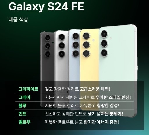갤럭시 S24 FE는 다양한 색상 옵션을 제공합니다. 그래파이트, 그레이, 블루, 민트, 옐로우 등 다섯 가지 색상으로 출시되어, 사용자들의 취향에 맞게 선택할 수 있습니다. 각 색상은 독특한 매력을 가지고 있어, 어떤 색상을 선택하더라도 만족스러운 선택이 될 것입니다.
