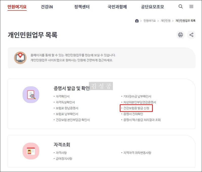 - 웹사이트에 접속한 후, '건강보험증 발급 신청' 메뉴를 선택합니다.