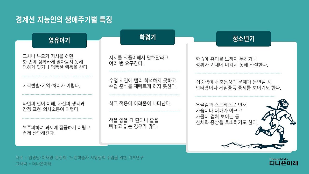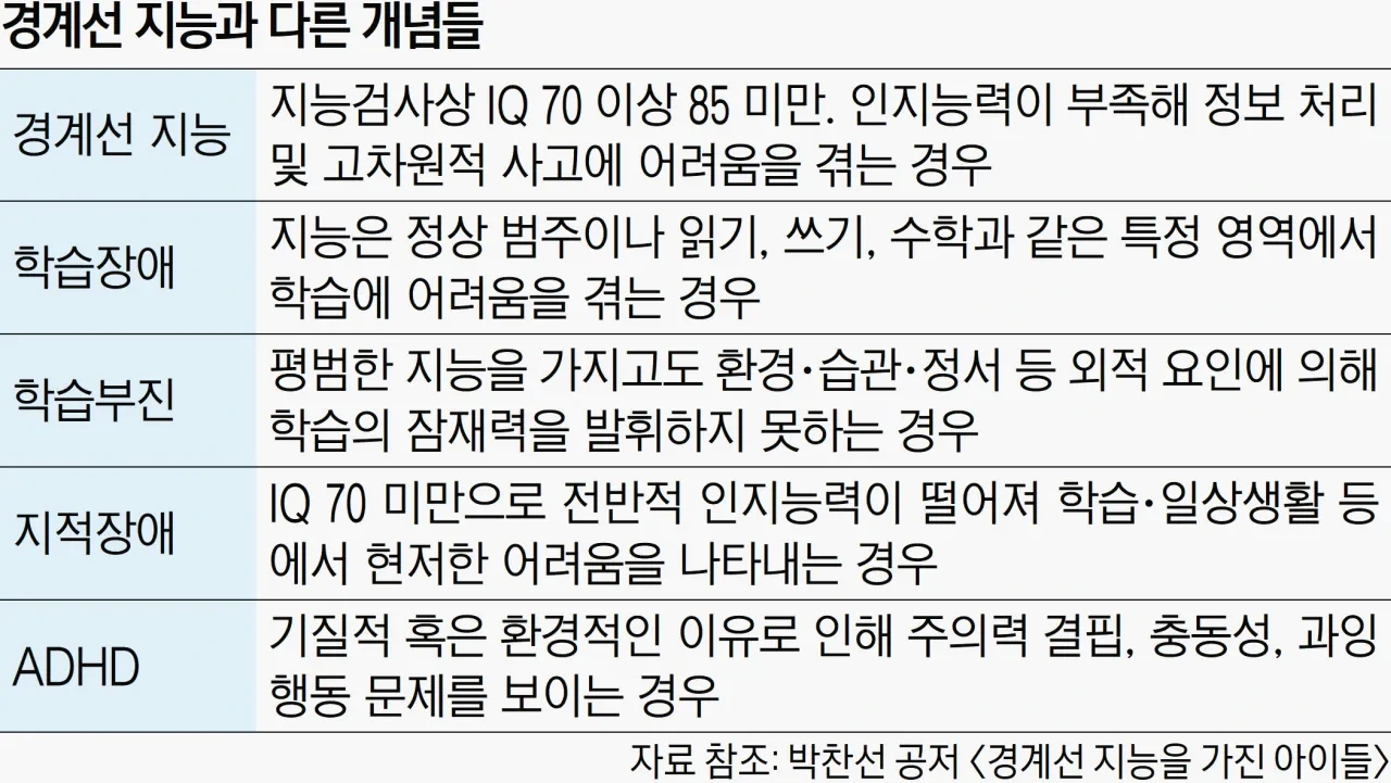 - 경계선 지능 : IQ 70~85, 정보 처리에 어려움이 있음.