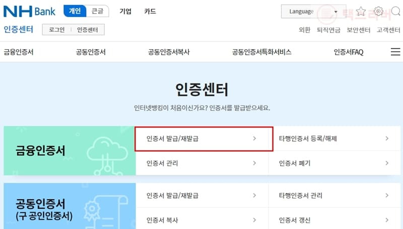 - 인증센터 선택: 인증센터 메뉴에서 '금융인증서 발급'을 선택합니다.