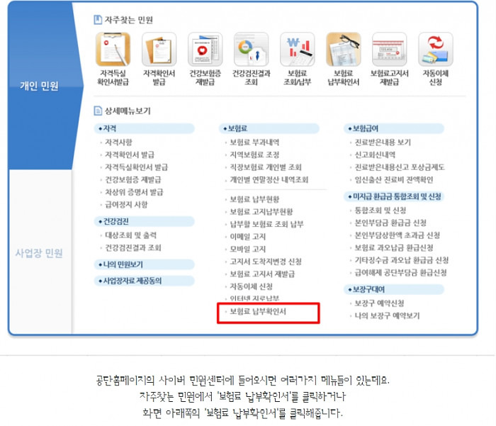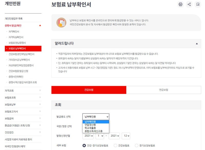 - 납부확인서 발급 메뉴 선택 : 홈페이지 내에서 '보험료 납부확인서' 메뉴를 찾아 클릭합니다.