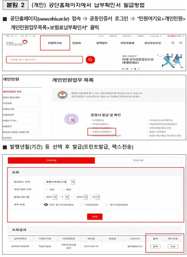 건강보험공단 홈페이지에서도 비슷한 절차로 납부확인서를 발급받을 수 있습니다. 홈페이지에 접속한 후, '보험료 납부확인서' 메뉴를 선택합니다.
