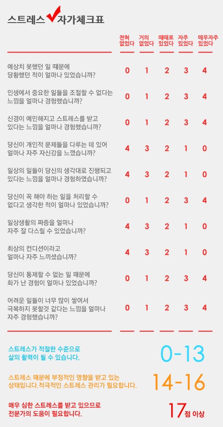 이와 같은 질문들이 포함되어 있습니다. 점수를 모두 합산한 후, 아래의 기준에 따라 자신의 스트레스 지수를 확인해보세요.
