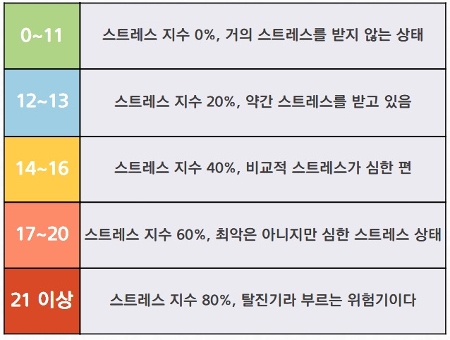 - 17 이상: 심각한 스트레스로 전문가의 도움이 필요함