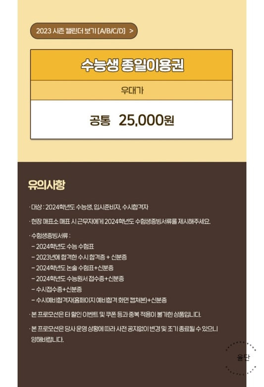 에버랜드에서는 수험생이 수험표를 제출하면 자유이용권을 25,000원에 구매할 수 있습니다. 정상가에 비해 매우 매력적인 가격이죠!