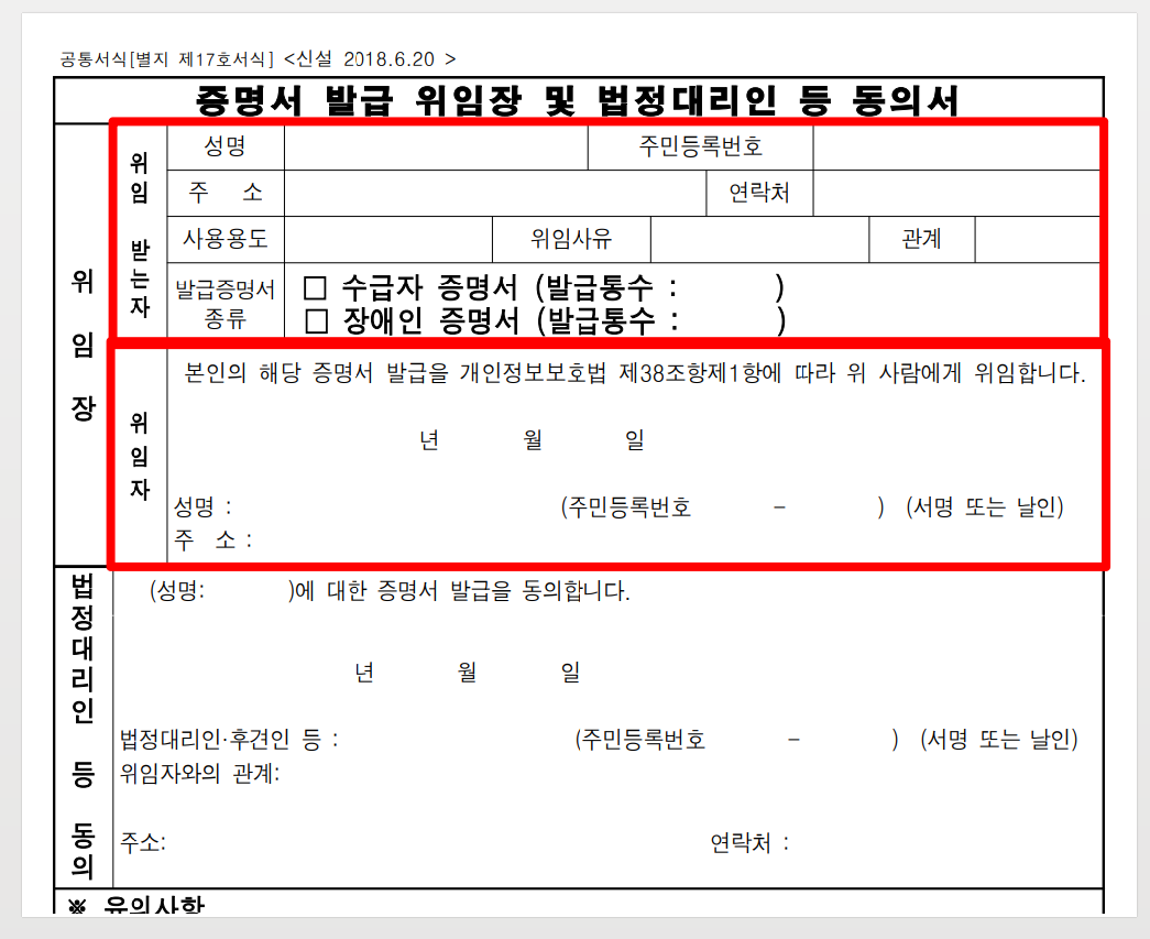 본인이 직접 신청할 수 없는 경우, 대리인을 통해 신청할 수 있습니다. 이 경우에는 위임장 및 법정대리인 동의서가 필요합니다.