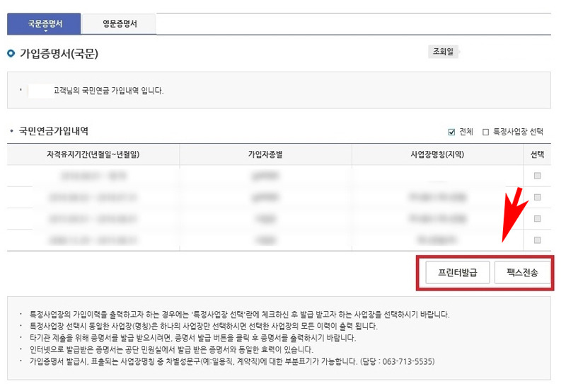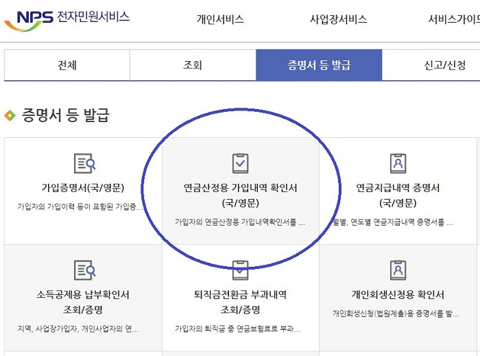 - '연금산정용 가입내역 확인서'를 선택합니다.