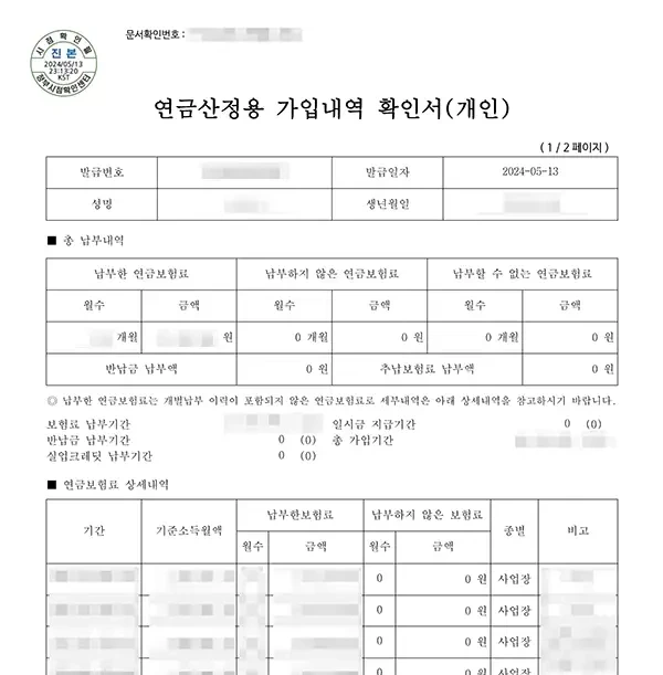 연금 산정용 가입내역 확인서는 국민연금 가입자가 자신의 가입 내역을 확인할 수 있는 공식 문서입니다. 이 문서는 연금 수급액을 산정하는 데 필요한 정보를 담고 있으며, 개인의 보험료 납부 내역과 가입 기간 등을 포함하고 있습니다.