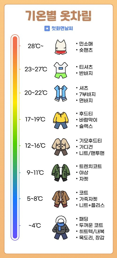 아래 이미지는 기온별 옷차림을 한눈에 볼 수 있는 가이드입니다. 각 기온대에 맞는 옷차림을 쉽게 확인할 수 있습니다.