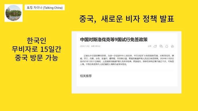 최근 관련 뉴스에 따르면, 중국 외교부는 한국을 포함한 9개국에 대해 무비자 입국을 허용한다고 발표했습니다. 이로 인해 항공업계는 긍정적인 반응을 보이고 있으며, 여행객들의 기대감이 높아지고 있습니다. (관련 뉴스: YTN, 이투데이)