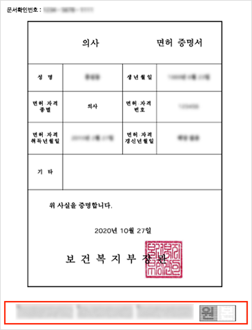 에서는 의사 면허 증명서의 예시를 보여주고 있습니다. 이와 같은 공식 문서는 발급 기관의 도장이 찍혀 있어야 하며, 발급 번호를 통해 진위를 확인할 수 있습니다.