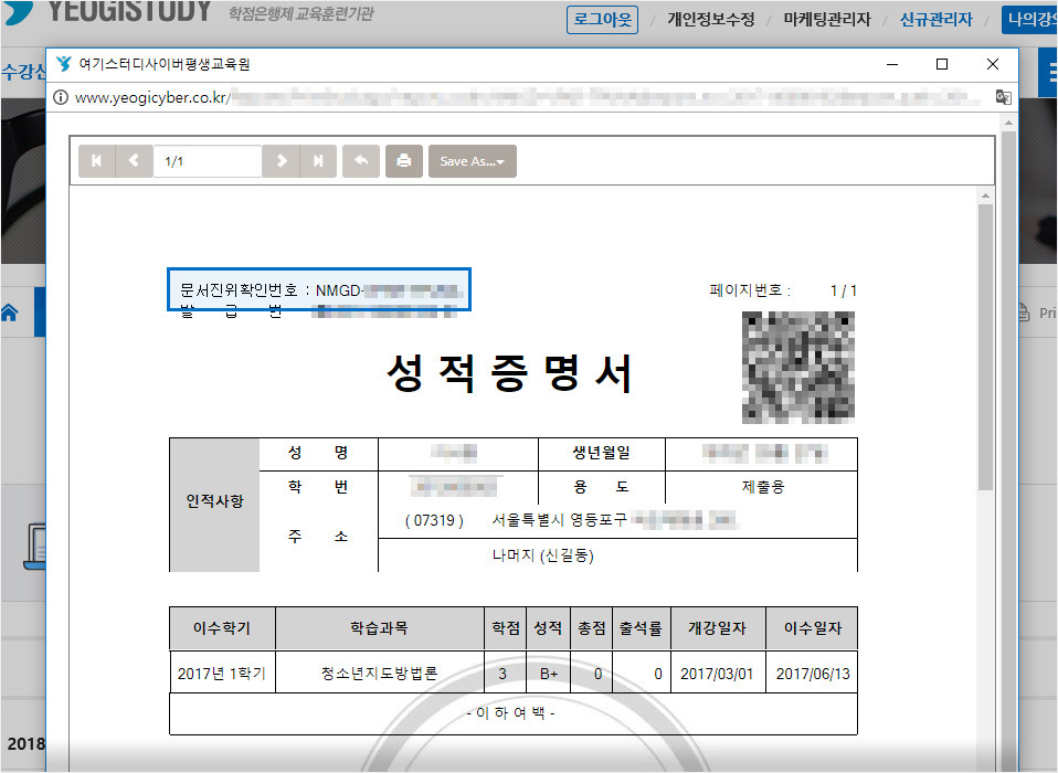 에서는 성적 증명서의 QR 코드 예시를 보여주고 있습니다. QR 코드를 스캔하면 발급 기관의 웹사이트로 연결되어, 해당 증명서의 진위를 쉽게 확인할 수 있습니다.