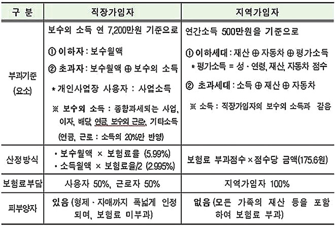 직장보험료는 직장에서 근무하는 근로자가 납부하는 보험료입니다. 이 경우, 근로자의 소득을 기준으로 보험료가 산정되며, 고용주와 근로자가 각각 절반씩 부담합니다. 반면, 지역보험료는 자영업자나 비정규직 근로자 등 직장에 소속되지 않은 사람들이 납부하는 보험료로, 소득뿐만 아니라 보유한 재산도 고려하여 계산됩니다. 이러한 차이로 인해 직장가입자는 상대적으로 보험료 부담이 적은 편입니다.