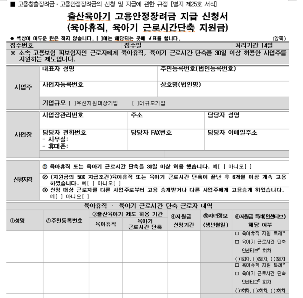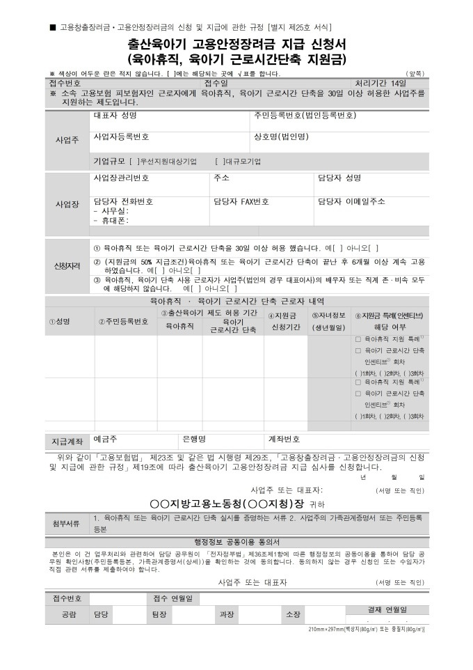 - 출산육아기 고용안정장려금 지급 신청서 (사업주 확인서 포함)