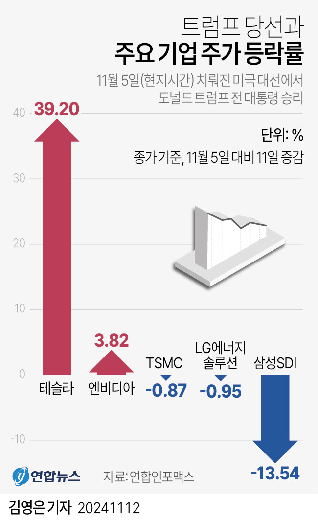 트럼프 당선 이후 테슬라의 주가는 급등했습니다. 최근 보고서에 따르면, 테슬라의 주가는 39.20% 상승하며 시장에서 큰 주목을 받았습니다. 이는 트럼프의 당선이 테슬라에게 유리하게 작용할 것이라는 기대감에서 비롯된 것입니다. 반면, 다른 경쟁업체들은 주가가 하락하는 모습을 보였습니다.