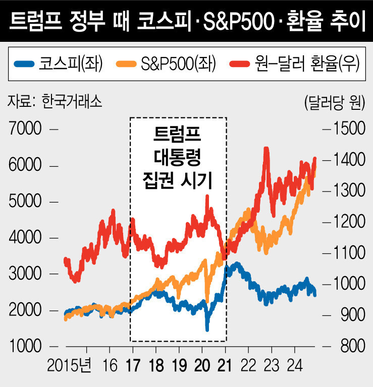 에서는 KOSPI와 S&P 500의 변동 추이를 그래프로 나타내고 있습니다. 이 그래프를 통해 두 지수의 상관관계를 분석하고, 트럼프의 정책이 한국 시장에 미친 영향을 이해할 수 있습니다.