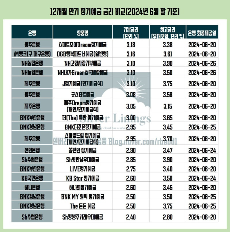 2024년 6월까지의 주요 은행들의 12개월 정기예금 금리를 비교한 결과는 다음과 같습니다.